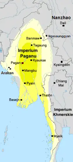 Imperium Paganu w okresie panowania Sithu II. Kroniki birmańskie za terytoria Imperium uważają również Kyaingdôn (ang. Kengtung) i Chiang Mai. Rdzenne terytoria centralne oznaczono kolorem ciemnożółtym, terytoria peryferyjne – jasnożółtym. W XIII w. Pagan włączył w zakres swej administracji kluczowe porty Dolnej Birmy.