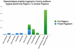 Po drugie, potrzeba gromadzenia ziemi w celu jej donacji na rzecz duchowieństwa, a także wynagradzania nią żołnierzy, napędzała aktywny rozwój nowych obszarów. Najwcześniejsze projekty irygacyjne koncentrowały się na Kyaukse, gdzie Birmańczycy wybudawali wiele nowych grobli i kanałów, oraz na Minbu, podobnie dobrze nawodnionym dystrykcie na południe od Paganu. Gdy w drugiej połowie XII w. ośrodki te osiągnęły stan pełnego rozwoju, Pagan zwrócił się ku jak dotąd słabo rozwiniętym terenom pogranicznym na zachód od Irawadi i na południe od Minbu. Te nowe obszary obejmowały zarówno tereny zdatne do irygacji i uprawy ryżu mokrego, jak i nie nadające się do irygacji i, w związku z tym, pozwalające jedynie na zasilaną jedynie wodą deszczową uprawę ryżu suchego, roślin strączkowych, sezamu i prosa. Rozwój rolnictwa i budowa świątyń na masową skalę stanowiły z kolei wsparcie dla krajowego rynku, a także stwarzały zapotrzebowanie na niektóre rodzaje pracy i materiałów. Tempo pozyskiwania gruntów, donacji religijnych i realizacji projektów budowlanych rosło powoli przed 1050 r., wzmogło się do 1100 r., ostro przyspieszyło wraz otwarciem dostępu do nowych terenów między ok. 1140 r. a ok. 1210 r. i utrzymywało się na niższym poziomie od 1220 r. do 1300 r.[71]