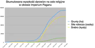 W połowie XIII w. problem ten znacznie się nasilił. Na centralnym obszarze Górnej Birmy, nad którym Pagan sprawował najsilniejszą władzę polityczną, zabrakło już łatwych do pozyskania i nawodnienia gruntów. Jednak żarliwe pragnienie gromadzenia zasług religijnych dla zapewnienia sobie lepszej reinkarnacji uniemożliwiało królom Paganu całkowite powstrzymanie składania darowizn, zarówno własnych, jak i członków dworu. Korona próbowała odzyskać część tych gruntów poprzez okresowe przetrzebianie szeregów duchowieństwa w imię oczyszczania praktyki buddyjskiej przejmowanie podarowanych wcześniej ziem. Chociaż niektóre z tych wysiłków zakończyły się sukcesem, potężne duchowieństwo buddyjskie na ogół skutecznie opierało się takim próbom[6][7]. Ostatecznie, tempo odzyskiwania ziemi było niższe od tempa jej przekazywania w ręce Sanghi. (Problem uległ dodatkowemu, choć nie tak poważnemu zaostrzeniu przez działania potężnych ministrów, którzy zaczęli toczyć spory dotyczące następstwa tronu i kosztem korony gromadzili własne ziemie). W roku 1280 od ⅓ do ⅔ całej ziemi uprawnej w Górnej Birmie znajdowało się w rękach duchowieństwa. Na skutek tego królestwo straciło źródło dochodów niezbędnych do utrzymania lojalności dworzan i wojska, co uruchomiło błędne koło zaburzeń wewnętrznych i zewnętrznych zagrożeń ze strony Monów, Mongołów i Szanów[6].