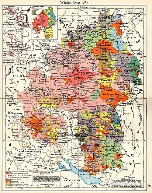 - ↑ Katalog wystawy wirtemberskiego muzeum krajowego: Baden und Württemberg im Zeitalter Napoleons, Stuttgart 1987, Tom 2, Referat: Hermann Schmid, Die Säkularisation und Mediatisation in Baden und Württemberg, s. 142. Nota bene: Przy przeliczaniu mil na system metryczny przyjęto, że mila wirtemberska = 7448,70 m.