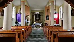 Obecna wieża kościelna została zbudowana w 1844 roku. Ze względu na ok. 60-centymetrowe zakrzywienie bywa nazywana krzywą wieżą[7] i stanowi znany element krajobrazu wsi. Wieża jest ceglana, czterokondygnacyjna, z dachem pokrytym blachą[6].