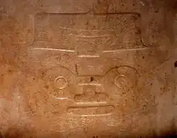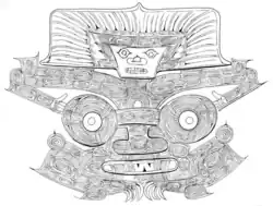 Ten obraz półczłowieka i zwierzęcia, powtórzony dwukrotnie z każdej strony, składa się z trapezoidalnej ludzkiej twarzy z nakryciem głowy z piórami, szerokim, płaskim nosem i okrągłymi oczami. Ramiona tej ludzkiej twarzy są zwrócone do wewnątrz, tak aby dotknąć pary oczu w okularach należących do bestii. Bestia z szerokim nosem i pyskiem z czterema kłami zdaje się opierać głowę na szponiastych przednich łapach. Co więcej, w każdym narożniku „conga”, zaczynając od góry, widzimy parę małych okrągłych oczu z poziomymi wypustkami, następnie duże oczy w okularach, potem znowu okrągłe oczy, a na końcu oczy w okularach. Według Wanga „to powiązanie z pełną formą projektu zachęca nas do interpretacji innych elementów: prążkowane pasy tuż nad okrągłymi oczami mogą na przykład oznaczać nakrycie głowy z piórami”[7].