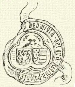 Na innej pieczęci Jadwigi, przywieszonej do dokumentu z 1387, umieszczono polskiego Orła zwróconego głową, zgodnie z zasadą kurtuazji herbowej, w stronę tarczy węgierskiej linii Andegawenów. Ukazany na pieczęci anioł-tarczownik (tenant – trzymacz tarczy) jest jednym z pierwszych przykładów zastosowania tego schematu ikonograficznego w sfragistyce polskiej[16]. Na małej pieczęci Jadwigi, przywieszonej do dokumentu z 1397, wyobrażono herb węgierskich Andegawenów z klejnotem w formie głowy strusia między dwoma piórami[17].
