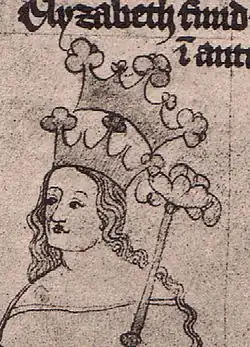 ![]() | Elżbieta Przemyślidka (Eliška Přemyslovna) | Wacław II | 20 stycznia 1292 | 1 września 1310 w katedrze w Spirze / Królowa od 9 grudnia 1310 | 28 września 1330 | Jan Luksemburski | ||