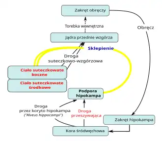 formacja hipokampa → sklepienie → ciało suteczkowate → droga suteczkowo-wzgórzowa → jądro przednie wzgórza → odnoga przednia torebki wewnętrznej → zakręt obręczy → zakręt hipokampa → droga przeszywająca → formacja hipokampa