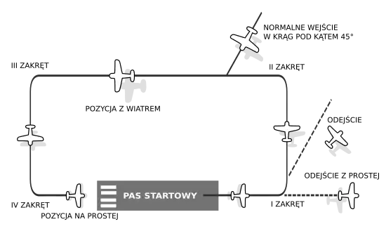 Wykorzystywany jest głównie na lotniskach lotnictwa ogólnego i w lotach z widocznością choć jego odpowiednikiem na dużych lotniskach jest krąg oczekiwania (ang. holding pattern) w procedurze przerwanego lądowania i przejścia na drugie okrążenie (ang. go-around).