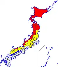 - pasa biegnącego wzdłuż Morza Japońskiego od prefektury Shimane na południowym zachodzie do północnego krańca Honsiu, a także wyspy Sado i Hokkaidō;