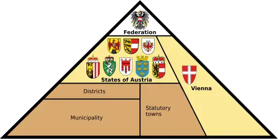 Kraje związkowe podzielone są na miasta statutarne (niem.: Statutarstadt, Stadtbezirk, l.m.: Statutarstädte, Stadtbezirke) oraz powiaty (niem.: Bezirk, Landbezirk, l.m.: Bezirke, Landbezirke, w Dolnej Austrii i Vorarlbergu Verwaltungsbezirk, l.m.: Verwaltungsbezirke).