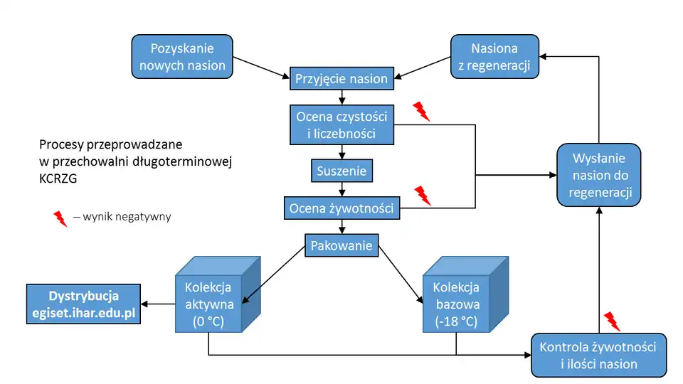 W 1979 w wyniku „Porozumienia Międzyresortowego” (Ministerstwo Rolnictwa, Polska Akademia Nauk, Ministerstwo Edukacji Naukowej i Ministerstwo Przemysłu Lekkiego) Instytut Hodowli i Aklimatyzacji Roślin został upoważniony do utworzenia Zakładu Krajowych Zasobów Genowych – ZKZG odpowiedzialnego za gromadzenie, opracowywanie i przechowywanie w stanie żywym roślinnych zasobów genowych w kraju oraz za współpracę z jednostkami zagranicznymi z tej dziedziny. Od roku 1987 nasiona są przechowywane w komorach chłodniczych z regulowaną temperaturą powietrza[3].