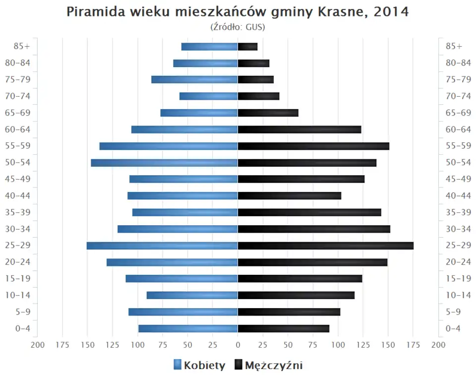 - Piramida wieku mieszkańców gminy Krasne w 2014 roku[6].