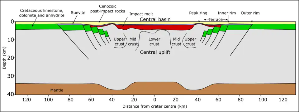 Krater ma około 150 km średnicy, z zewnętrznym pierścieniem o średnicy ok. 240 km[3] (starsze oszacowania podają inne wartości, np. 180 km[4]) i około 1 km głębokości. Jego początkowa głębokość wynosiła około 30 km[5]. Struktura uderzeniowa pochodzi z przełomu kredy i paleogenu, sprzed 66,038 mln lat[1][2] (według niektórych jest około 300 tysięcy lat starsza[6]).