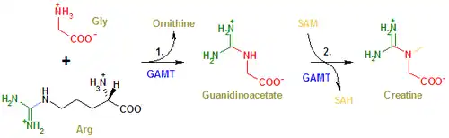 Glicyna reaguje w ustroju z argininą i wobec enzymu fermentu transaminacyjnego zamienia się na kwas guanidynooctowy, czyli glukocyjaminę, z argininy tworzy się wówczas ornityna (która stymuluje wydzielanie hormonu wzrostu). Z glukocyjaminy w ustroju powstaje kreatyna. Wytworzona kreatyna łączy się w tkankach z kwasem fosforowym tworząc kwas kreatynofosforowy (fosfagen), niezbędny do procesów życiowych w tkankach zwierzęcych.