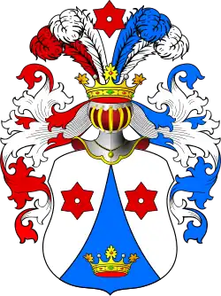 W polu srebrnym - dwa czerwone kółka sześciozębate od ostróg, między które wchodzi pole trójkątne błękitne o łukowatych bokach, a w nim złota korona. W klejnocie kółko (jak na tarczy) między czterema piórami strusimi: czerwonym i białym z prawej strony, błękitnym i białym z lewej.