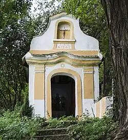- kościół parafialny pw. św. Jakuba Apostoła stoi na wyraźnym wzniesieniu we wschodniej części wsi, wysoko ponad korytem Nysy Kłodzkiej, w pobliżu tutejszego dworu. Wewnątrz w transepcie po prawej stronie renesansowa chrzcielnica z 1590 r. z herbami rodów von: Haugwitz, Nostitz, Pannwitz, Reden, Rodtkirch, Schellendorf, Zedlitz[7]. Naturalna obronność miejsca została dodatkowo wzmocniona poprzez otoczenie świątyni owalnym, kamiennym murem z dwiema bramami (po stronie południowej i północno-zachodniej) oraz dwiema furtkami (prowadzącą do dworu w kierunku wschodnim oraz ku plebanii w stronę zachodu). Obecna postać muru obronnego to efekt przebudów z XVII–XVIII w., jednak jego pierwotne założenie jest starsze. Brama południowa o ostrołukowym prześwicie zwieńczona jest prostą attyką, za którą kryje się jednospadowy dach. Z przodu stoi wysoka kolumna zwieńczona metalowym krzyżem i barokowa, kamienna Grupa Ukrzyżowania (poddana renowacji w 1883 r.). Obok bramy znajduje się XVIII-wieczna kaplica-kostnica z namiotowym dachem krytym gontem, a w murze wnęka z rzeźbą Ecce homo (figurą Chrystusa stojącą przy marmurowej kolumnie). Brama północno-zachodnia, pozbawiona szczytu, ma otwór sklepiony półkoliście.