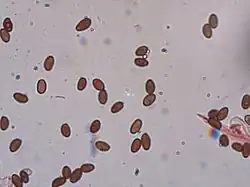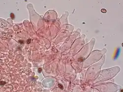 Podstawki 4-zarodnikowe, maczugowate. Zarodniki gładkie, ciemnobrązowe, nieprzezroczyste, różnokształtne, w widoku z przodu często trójkątne, z profilu asymetryczne lub lekko migdałowate. Cheilocystydy szkliste, cienkościenne, gęsto upakowane, cylindryczne, zazwyczaj z krótkim i szeroko rozwartym wierzchołkiem, pokryte licznymi łuskami. Pleurocystydy liczne, podobne do cheilocystyd, szkliste, cienkościenne, z krótkim, szerokim i tępym wierzchołkiem. Kaulocystydy bardzo liczne, najczęściej w grubych pęczkach, polimorficzne, czasami z zębami wierzchołkowymi. Sprzążki obecne[4].