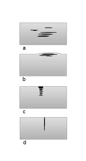 - odsiarczkowe pękanie naprężeniowe (ang. SSC, Sulfide Stress Cracking)[3] – powstające pod wpływem dodatkowych naprężeń podłużne szczeliny