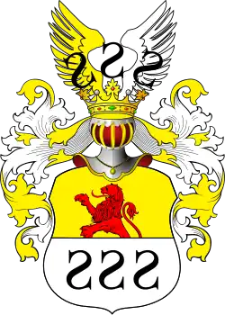 Na tarczy ściętej, w polu górnym złotym - pół czerwonego lwa; w dolnym srebrnym - trzy czarne litery S odwrócone. U szczytu dwa skrzydła: złote i srebrne, na których i między którymi S odwrócone. Labry od góry czerwono-złote, od dołu czarno-srebrne.