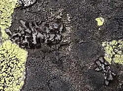 Licznie występują apotecja lecideowe. Mają średnicę 0,5–1,5 mm, są okrągławe, początkowo posiadają krótkie trzoneczki, później są siedzące. Ich czarne, płaskie lub wypukłe tarczki są głęboko, koncentrycznie rowkowane[3]. W jednym worku powstaje po 8 grubościennych, elipsoidalnych i prostych askospor o rozmiarach 7–15 × 4-7 μm[3].
