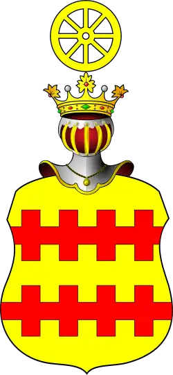 W polu złotym dwa pasy blankowane z obu stron. W klejnocie koło złote[4].