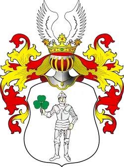 W polu srebrnym – rycerz stojący w zbroi, z listkami koniczyny w prawej ręce, z lewą na biodrze opartą. W klejnocie dwa skrzydła srebrne. Labry czerwono-srebrne[1].