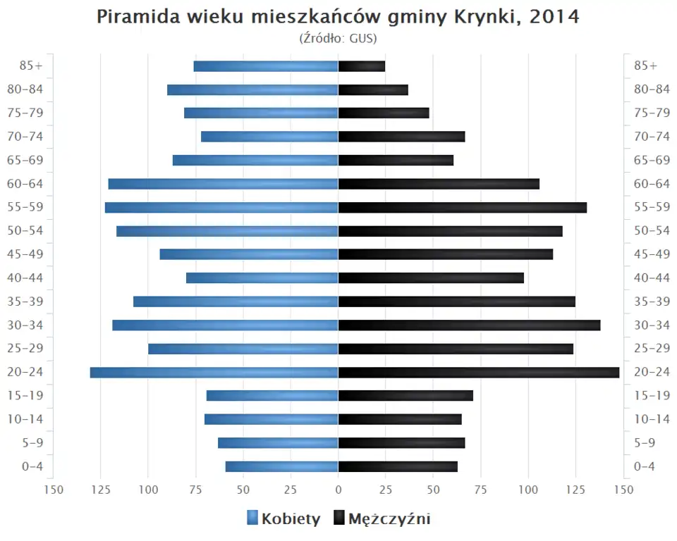 - Piramida wieku mieszkańców gminy Krynki w 2014 roku[1].