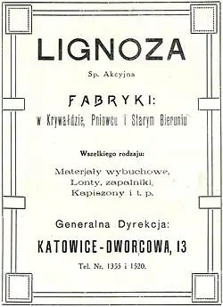 W 1922 właścicielem fabryki została Spółka Akcyjna Lignoza z kapitałem niemieckim. Od 1924 kapitał spółki był już wyłącznie polski. Lata 1924-1929 to lata modernizacji i rozbudowy. Starano się też zwiększyć bezpieczeństwo załogi. W latach 1925–26 ruszyła produkcja prochu lontowego i bezdymnego prochu myśliwskiego, od 1928 fabryka zmieniła technologie produkcji saletrzano-amonowych materiałów wybuchowych, co zaowocowało wzrostem bezpieczeństwa produkcji. A także znacznym wzrostem produktywności. W latach 1930–31 zaczęto też produkować materiały pirotechniczne, zakończając dopiero w 1993. W tym czasie fabryka była przez wiele lat jedynym a później jednym z większych producentów.