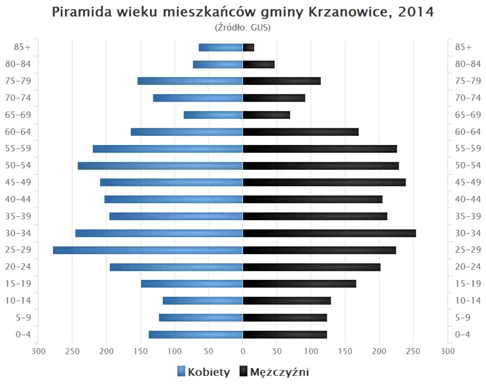 - Piramida wieku mieszkańców gminy Krzanowice w 2014 roku[1].