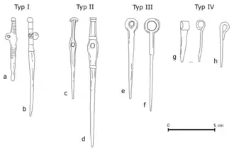 - Peškar I. 1967 "Kotázce účelu závésných jehlicovitých bodců z doby řimské", „Archeologicke Rozhledy”, t. 19, s. 355-367.