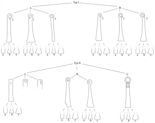 - IIC – trapezowata sztabka z silnie wyodrębnionym, wykutym uchem w górnej części zabytku