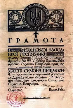 - О. Кучерук. Маловідомі документи з історії відзнаки УНР Хрест Симона Петлюри. „Військово-історичний альманах”. 1, s. 124–131, 2003. Київ. (ukr.).