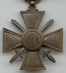 - ↑ Oficjalna nazwa Krzyż Wojenny. Wersję Krzyż Wojenny 1914–1918 zaczęto stosować po ustanowieniu Krzyża Wojennego TOE