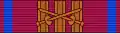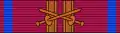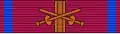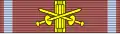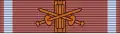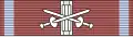 Wstążka Krzyża Zasługi z Mieczami jest pąsowa (pierwotnie była amarantowa) o szerokości 40 mm z niebieskimi paskami po bokach o szerokości 3 mm.