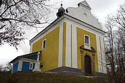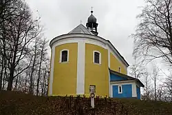 Na pobocznym, niższym szczycie Krzyżowej (498 m n.p.m.) stoi barokowa kaplica pw. św. Krzyża z 1736 fundacji Oppersdorfów. Jest ona murowana, jednonawowa, z wyodrębnionym prezbiterium zamkniętym półkoliście, z dobudówką (zakrystią). Nakryta jest dwuspadowym dachem z sygnaturką. Od frontu główne wejście w półkoliście zakończonym kamiennym portalu między dwoma pilastrami podtrzymującymi fronton zbliżony w kształcie do entrecoupè. Ściana frontowa zwieńczona szczytem. W prezbiterium znajduje się kamienna rzeźba Ukrzyżowanie wykonana przez Michała Ignacego Klahra. Obok kaplicy stoi krzyż z 1884 a wokół stacje drogi krzyżowej.