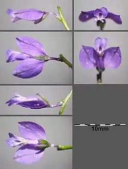 - Zebrane po 5–30[16] (rzadko do 40[15]) w szczytowe kwiatostany groniaste. Są one gęste[18], początkowo stożkowate, w czasie owocowania wydłużają się[19]. Na szczycie kwiatostany nie są ostre (czubate), ponieważ pączki kwiatowe są większe od krótkich przysadek[11]. Przysadki osiągają do 2[16]–2,5[17] mm długości (są dwa razy krótsze od rozwiniętych szypułek kwiatowych[20]) i są błoniaste poza zielonkawym grzbietem[19]. Szypułki są fioletowe, niebieskie do różowych[17]. Kielich składa się z trzech drobnych (do 3 mm długości[6]), wąskotrójkątnych, brunatnych lub zielonych działek i dwóch okazałych, niebieskich lub fioletowych[17], okrywających koronę z boków i zwanych skrzydełkami (alae). Skrzydełka są podłużnie eliptyczne, na szczycie tępe lub zaostrzone o długości od 5,6 do 9 mm (najczęściej od 6,5 do 8,5 mm) i szerokości od 3,3 do 5,6 mm. Na skrzydełkach między podłużnymi żyłkami przewodzącymi wyraźnie widoczne są liczne połączenia poprzeczne dzielące ich powierzchnię na kilka do kilkunastu poletek (oczek). Skrzydełka są na tyle duże, że w czasie owocowania okrywają w całości owoc. Korona kwiatu powstaje z trzech zrośniętych w łódeczkę płatków i jest ciemnoniebieska, rzadziej różowa lub biała. Osiąga 6–8 mm długości[11]. Zakończona jest trzema łatkami, z których dwie boczne są całobrzegie[17], a środkowa na końcu pocięta jest na kilkanaście do ponad 20, rzadko ponad 30, ząbków i frędzli[11] barwy białawej[15]. Pręcików jest 8 w dwóch wiązkach przyrośniętych do korony[18]. Słupek górny z jedną szyjką zakończoną dwudzielnym znamieniem[17].