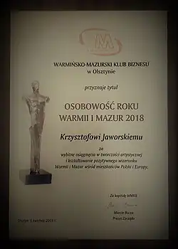 - W roku 2019 został wybrany przez Warmińsko-Mazurski Klub Biznesu Osobowością Roku w kategorii „Kultura”[25].