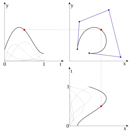 Kształt krzywej Béziera opisują wielomiany, dla których przyjęto dziedzinę Stopień wielomianu wprost zależy od liczby punktów kontrolnych – wynosi (liczba punktów kontrolnych minus jeden). Wielomiany są zwykle przedstawiane w bazie wielomianów Bernsteina[1] (oznaczane jako bądź w literaturze anglojęzycznej ). Wielomiany bazowe Bernsteina są wygodne w tym sensie, że punkty kontrolne są w naturalny sposób współczynnikami takiego wielomianu – nie trzeba dokonywać dodatkowych przeliczeń.