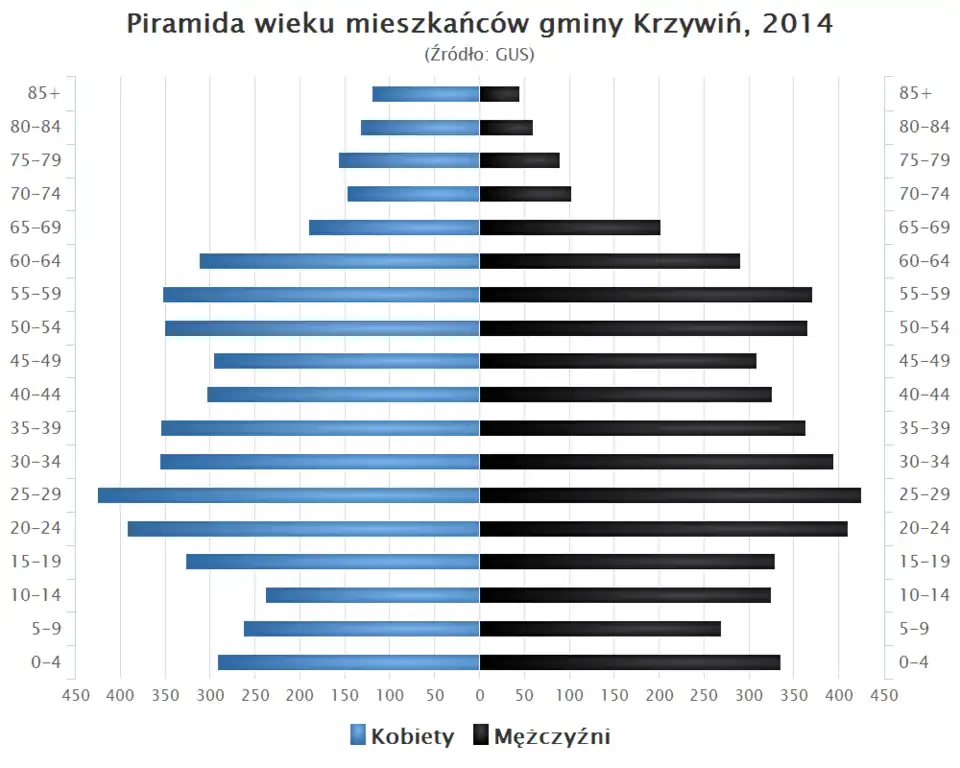 - Piramida wieku mieszkańców gminy Krzywiń w 2014 roku[1].