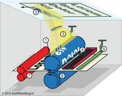 1. elektroda elektryzująca bęben, 2. lampa oświetlająca oryginał, 3. światło odbite od oryginału padające na bęben, 4. kaseta z tonerem, 5. i 6. elektroda elektryzująca papier wraz z bębnem lub listwą dociskającą papier, 7. wałki utrwalające.