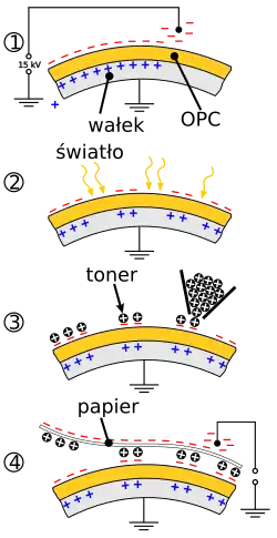 1. elektryzowanie, 2. naświetlanie, 3. przenoszenie tonera na bęben, 4. przenoszenie tonera z bębna na papier.