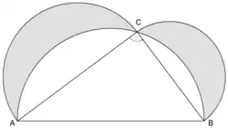 Księżyce Hipokratesa dla trójkąta prostokątnego[a]. Suma pól księżyców Hipokratesa jest równa polu trójkąta
