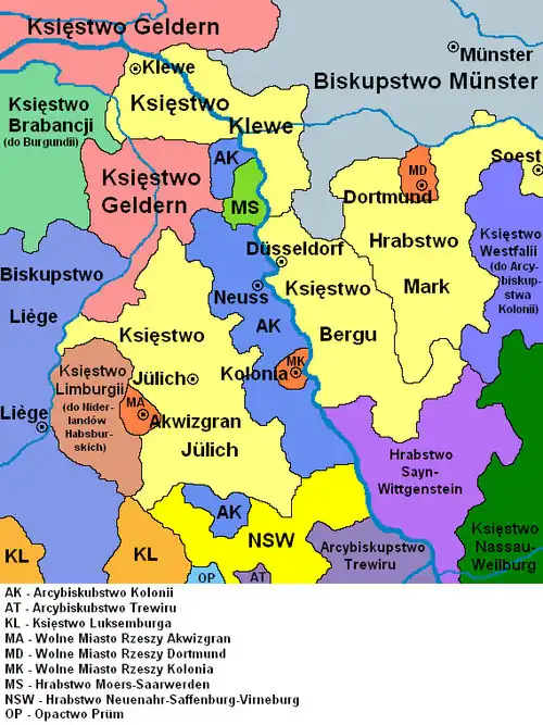 w latach 1389–1437 unia personalna z Ravensberg, od 1423 z Jülich, a od 1614 z Palatynatem Neuburskim
