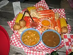 Kuchnia opiera się na ryżu z warzywami i dodatkami mięsnymi, głównie wieprzowiną lub skorupiakami, licznie występującymi w okolicznych bagnach. Kraby, raki, znane jako crawfish, crayfish lub mudbugs, oraz krewetki, są częstym elementem wielu potraw.