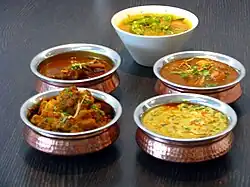 Zwykły posiłek hinduski składa się zazwyczaj z 2-3 dań, z obowiązkową soczewicą, ryżem, marynatami, jogurtem i sosem chutney. Ilość potraw zwiększa się na specjalne uroczystości rodzinne i święta. Przygotowuje się wtedy więcej dań mięsnych i rybnych, a w domach wegetarian – dań z warzyw oraz różne sosy i sałatki. Ryż może być zastąpiony chlebkami indyjskimi- podpłomykami (ćapati), w bogatych domach podaje się ryż i chlebki. Posiłek kończą orzechy, świeże lub suszone owoce albo nasiona i orzeszki mocno przyprawione korzeniami (pan) oraz napar z korzeni ułatwiający trawienie, jak na przykład napar z nasion włoskiego kopru lub kardamonu.