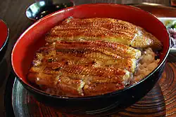- ↑ Kaba-yaki → sposób przyrządzania węgorza lub innych, długich ryb bezłuskowych: rozcięta, wypatroszona i oczyszczona z ości ryba, rozkładana jest na płasko, krojona w kwadratowe filety, maczana w słodkim sosie sojowym i grillowana.