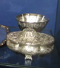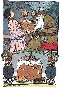 Posiłki bojarów i elity społecznej składały się z wyszukanych potraw, serwowanych w obfitych ilościach, szczególnie podczas dni świątecznych[1]. Podczas uczt carskich na stole gościły zimne i ciepłe zakąski, pieczone łabędzie, pieczone głowy baranie i świńskie, gęsi i kury, bliny, korowaj, galarety z mięsa, ikra, zupa rybna i zupa z kury, sosy tzw. wzwary, kasze, kapusta kiszona, solone ogórki, rzepa, arbuzy, dynie, winogrona z Bizancjum, miody pitne, kwas, wina greckie i piwa do picia. Pod koniec uczty słudzy wnosili pierniki i pi(e)rożki. Czas umilały gościom muzyka, tańce i śpiew. Potrawy i napoje serwowano w naczyniach wykonanych ze złota, srebra lub pozłacanych, bogato zdobionych inkrustacjami oraz wysadzanych drogocennymi kamieniami. Na stole znajdowały się też zestawy sztućców przeznaczonych specjalnie do porcjowania mięsa, które było podawane w całości lub dużych sztukach[6].