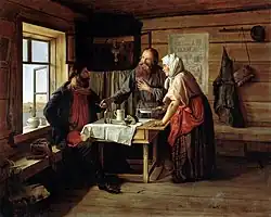 Do gotowania gospodyni służyło zaledwie kilka garnków i rondli oraz olbrzymi piec, który ze względu na swą konstrukcję nadawał się do powolnego i długotrwałego gotowania zup, potraw jednogarnkowych i kaszy, stanowiących podstawę chłopskiego jadłospisu[10]. Każdy członek rodziny miał własną łyżkę do jedzenia, zaś potrawa była umieszczona w jednym, wspólnym naczyniu, do którego każdy sięgał swoją łyżką[10]. Osobiste łyżki były bogato rzeźbione lub malowane techniką chochłomy[10][12]. Wspólne jedzenie pozwalało zaoszczędzić na kupowaniu i myciu dodatkowych naczyń stołowych. Również gość był proszony o wzięcie udziału we wspólnym posiłku[10]. W tym czasie na stole pojawiły się także nowe, bardziej wymyślne potrawy postne[1].