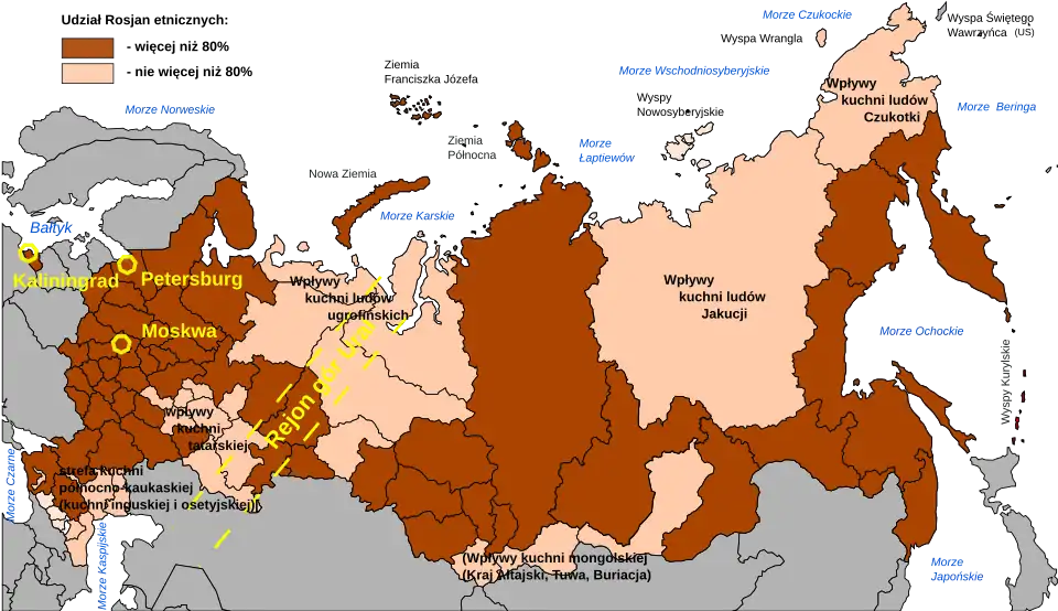 Współczesna kuchnia rosyjska łączy w sobie elementy tradycyjnych kuchni z różnych odległych obszarów: terytorium nad Morzem Bałtyckim (skąd pochodzi stosowanie masła, śmietany i jaj), rejonów górskich na granicy z Chinami (standardem są tu potrawy z jagnięciną i sfermentowane mleko klaczy), aż po Morze Ochockie, gdzie lokalnym przysmakiem jest bałyk i szpik kostny jesiotra, oraz rejony poza kołem podbiegunowym, których mieszkańcy tradycyjnie sporządzają z surowych ryb stroganinę. Ważne miejsce w kuchni rosyjskiej odegrała kuchnia gruzińska, z której zaadaptowali do swojej kuchni, charakteryzującej się łagodnym smakiem, pikantne szaszłyki, kurczaka-tabakę i charczo[10].