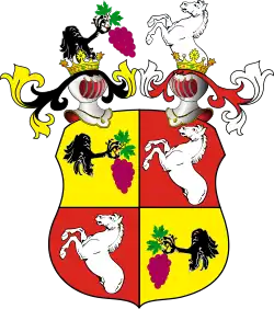 Na tarczy czterodzielnej, w polach I i IV złotych – łapa krucza czarna, trzymająca w szponie winne grono czerwone na gałązce z dwoma listkami zielonymi; w II i III czerwonych – połukoń w prawo srebrny. W klejnocie I łapa krucza jak na tarczy, w II - połukoń srebrny. Labry I czarne podbite złotem, II czerwone srebrem.
