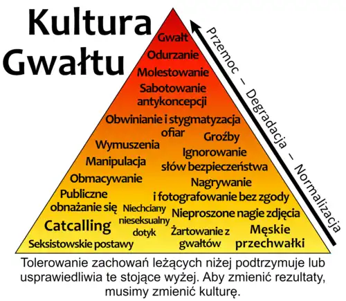 Kultura gwałtu objawia się także poprzez powszechność przekonań trywializujących znaczenie i zasięg przemocy seksualnej, obwiniających ofiary lub poprzez seksualne uprzedmiotawianie kobiet. Biorąc pod uwagę statystyki zgwałceń oraz obecność owych przekonań wśród społeczeństwa, bardzo wiele kultur zachodnich, muzułmańskich i innych kwalifikuje się pod pojęcie kultury gwałtu[14][15][16][17].