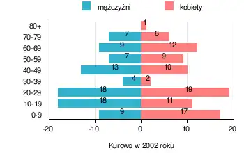(w przedziałach wiekowych w 2002 roku)OGÓŁEM 0-9 10-19 20-29 30-39 40-49 50-59 60-69 70-79 80 + I. OGÓŁEM os. 172 26 29 37 6 23 16 21 13 1 — odsetek % 100 15,1 16,9 21,5 3,4 13,4 9,3 12,2 7,6 0,6 1. WEDŁUG PŁCI A. Mężczyzn os. 85 9 18 18 4 13 7 9 7 — — odsetek % 49,4 5,2 10,5 10,5 2,2 7,6 4,1 5,2 4,1 — B. Kobiet os. 87 17 11 19 2 10 9 12 6 1 — odsetek % 50,6 9,9 6,4 11 1,2 5,8 5,2 7 3,5 0,6